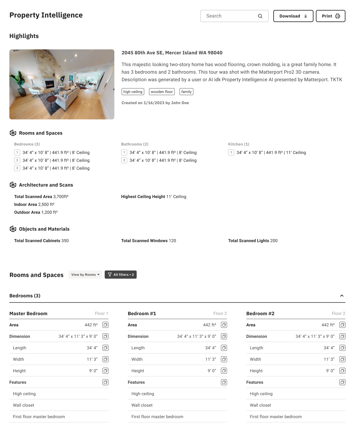 Matterport Property Report analyzes data gathered during the property scan and produces insightful reports for the property. Users can access detailed industry-standard property reports that include summaries of their spaces and room-by-room breakdowns of area and dimensions.
